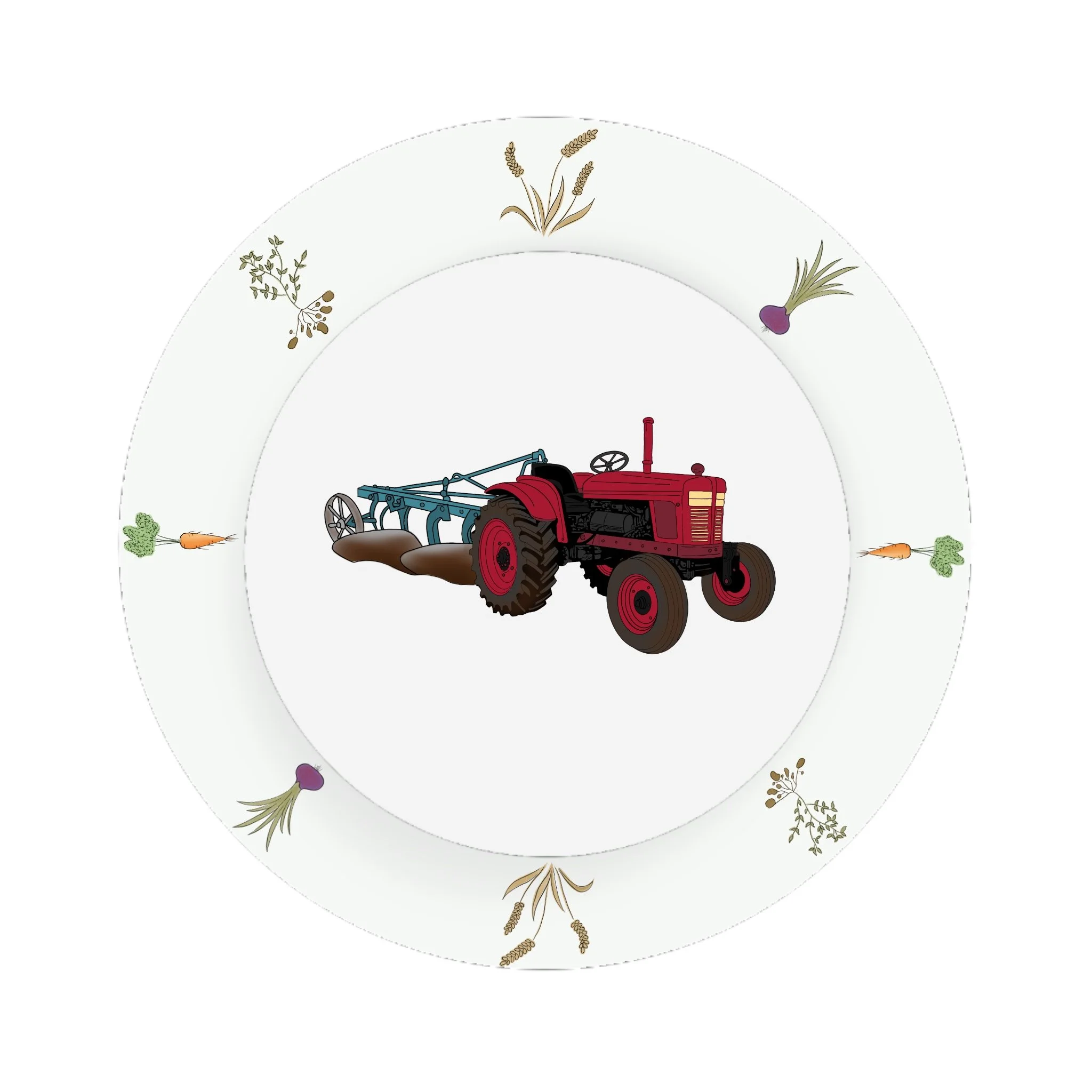 Previously, I experimented with presenting a tractor in both black and white and in colour to see how each version appeared on the plate. After careful consideration, I found that the black and white design was more effective. To me I found that it doesn’t distract from the background, allowing the overall illustration to retain its focus. Most importantly, it draws attention to both the outline of the plate and the accommodating text, which plays a key role in communicating my message.